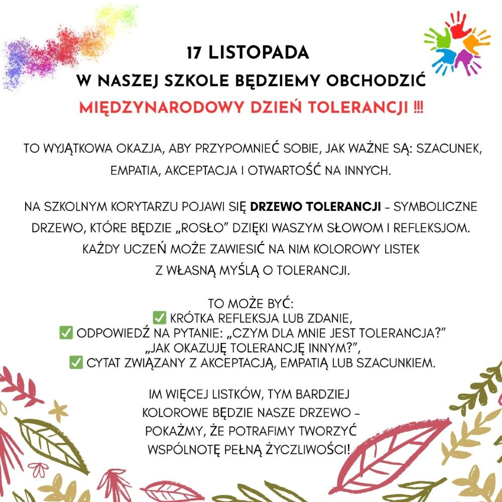 17 listopada w naszej szkole będziemy obchodzić Międzynarodowy Dzień Tolerancji