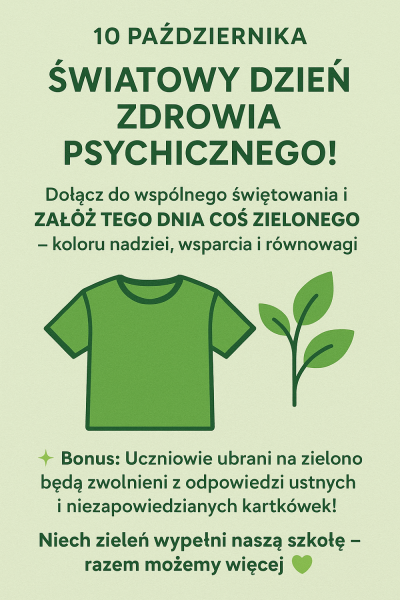 Ubierzcie się tego dnia na zielono - kolor nadziei, wsparcia i równowagi.Uczniowie, którzy dołączą do akcji, będą zwolnieni z odpowiedzi ustnych oraz niezapowiedzianych kartkówek !Niech ten dzień upłynie w atmosferze życzliwości, zrozumienia i wzajemnego wsparcia. Pamiętajmy, że dbanie o zdrowie psychiczne to nie tylko jednorazowe wydarzenie, ale ważny element codziennego życia szkolnego.Razem możemy budować szkołę, w której każdy czuje się zauważony i wspierany.